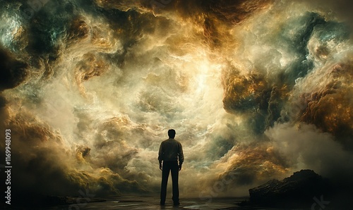 © regulator, Obraz premium Man standing before surreal, colorful cloudscape.