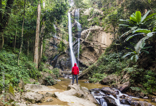 © sergeyonas, Naklejka premium man standing in forest near huge waterfall in jungle of thailand