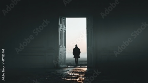 Obraz premium Man standing in open doorway, contemplating lifes possibilities