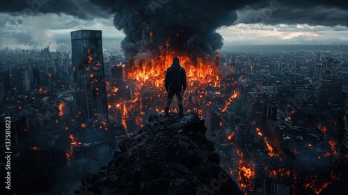 © Sangsung, Obraz premium Man Standing on Edge Overlooking City in Flames and Smoke