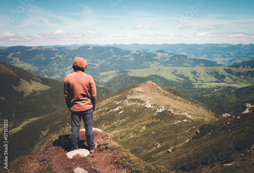 © Nickolay Khoroshkov, Naklejka premium Man standing on the top of the mountain