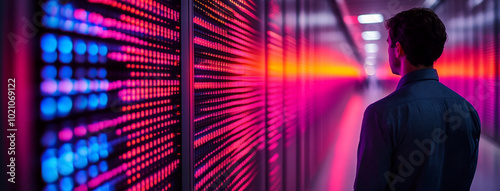 © Sudarshana, Fototapeta premium man standing toward a futuristic digital technology wall screen covered room with high tech environment and data