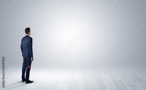© ra2 studio, Fototapeta premium Man standing with his back in an empty room with object in his hand