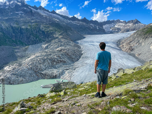 Naklejka premium Man stands admiring the stunning view of vast river of ice flowing into a turquoise glacial lake. Dramatic mountain peaks rise majestically above Rhone Glacier, accentuating the grandeur of landscape.