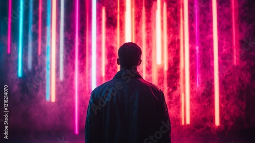 Naklejka premium Man stands before a vibrant neon light display
