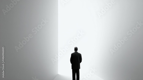 © Alicia, Obraz premium Man stands facing bright light at the end of a tunnel or corridor.