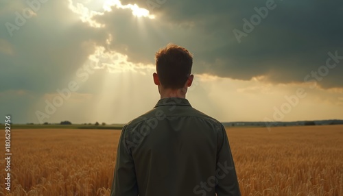 © Maryna, Obraz premium Man stands in golden wheat field looking up at stormy sky with sun rays breaking through. Back view of person watching dramatic weather over farmland. Peaceful solitude amidst nature.