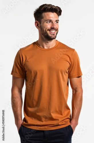 © Svetlana, Fototapeta premium man stands on the left in a color mocha T-shirt, on a white background