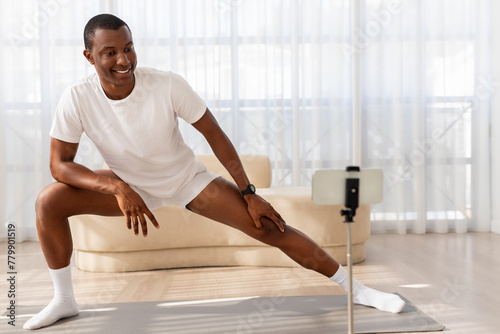© Prostock-studio, Fototapeta premium Man stretching while recording on smartphone at home