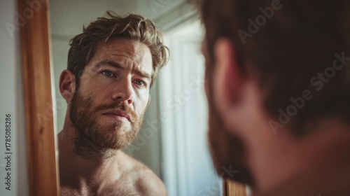 © Anat art, Fototapeta premium Man Struggles With Guilt and Self-Denial While Erasing His Reflection in a Bathroom Mirror During Morning Hours