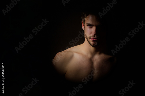 © Volodymyr, Naklejka premium Man studio portrait. Silhouette portrait of a young man. Man in shadows. Muscular sexy body silhouette in dark. Young male face with shadow on studio lowkey. Studio shot of mans models faces.