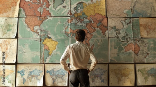 © Zaenatulumma, Obraz premium Man studying vintage world maps on wall.