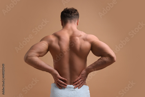 © New Africa, Fototapeta premium Man suffering from back pain on beige background, back view