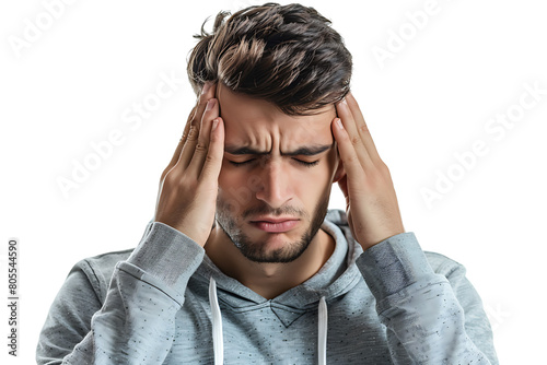 © Irfan, Naklejka premium Man suffering from headache, pressing fingers to temples with closed eyes on isolated transparent background