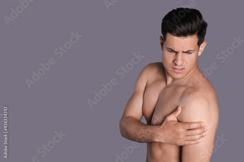 Fototapeta premium Man suffering from shoulder pain on grey background. Space for text
