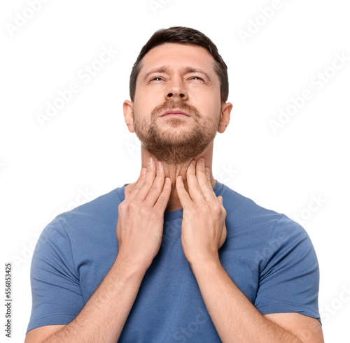 Fototapeta premium Man suffering from sore throat on white background