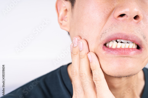 © saran, Obraz premium Man suffering from toothache, hand touching wisdom tooth. Dental, healthcare concept
