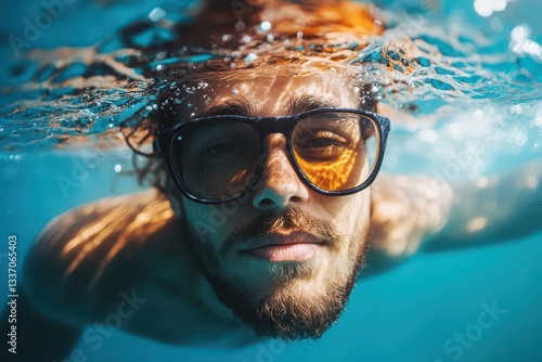 © Andrii, Fototapeta premium Man swimming underwater with sunglasses and beard