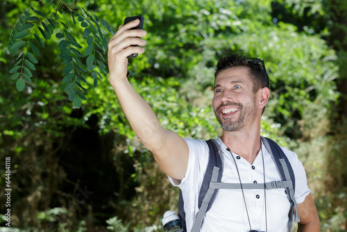 © auremar, Obraz premium man taking a selfie of himself in the countryside