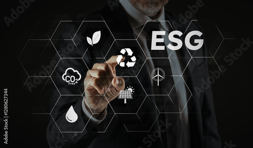 © Fabio Principe, Fototapeta premium Man touch a screen to analyze ESG Business investment strategy economy Environment social governance