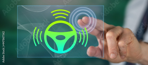 © thodonal, Fototapeta premium Man touching a self-driving car concept