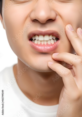 © Autism in Focus, Fototapeta premium Man touching both cheeks with hands showing toothache jaw discomfort and dental pain on white background