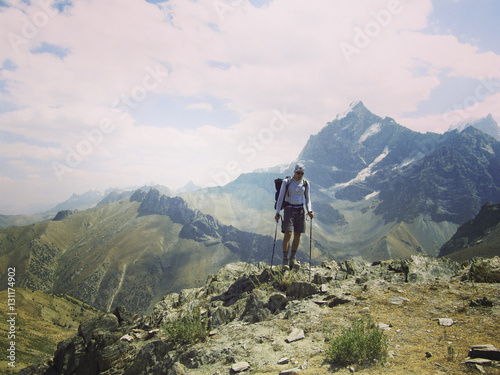 Fototapeta premium Man tourist walking the mountains with a backpack.