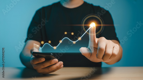 Fototapeta premium Man tracks upward financial growth on holographic chart using smartphone analytics for business success