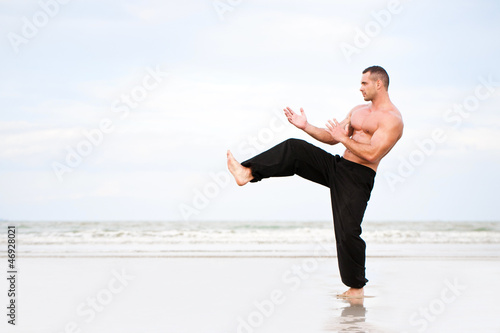 © Kristina Afanasyeva, Obraz premium Man training karate at the beach