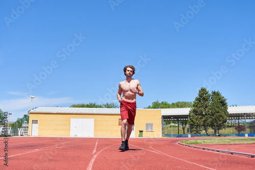 Naklejka premium man training on a running track. general view of a shirtless man running.
