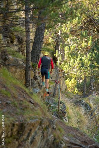 © martinscphoto, Fototapeta premium MAN TRAINS RUNNING THROUGH THE MOUNTAIN IN THE PYRENEES OF Andorra.