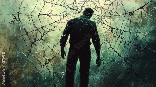 © AbstractAI, Obraz premium Man trapped in a vast spider web, symbolizing the complexities and struggles associated with mental disorders and emotional entrapment.