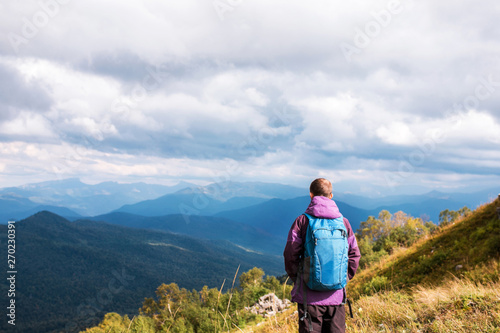 © Evgeniia, Naklejka premium Man traveler in mountains enjoying aerial view.