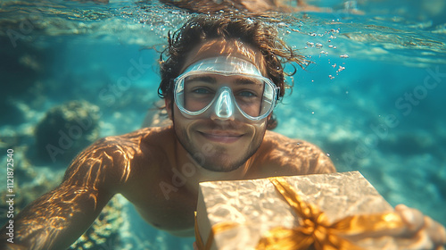 © Nastassia, Fototapeta premium man underwater holding a gift in his hand