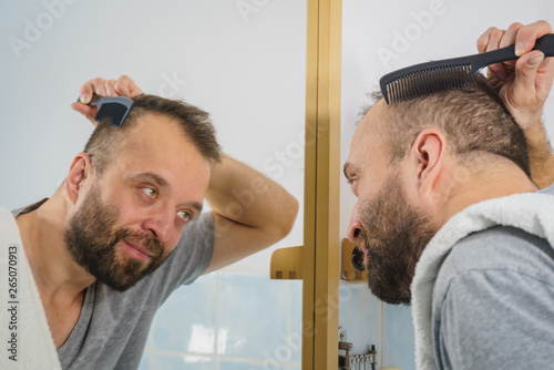 © Voyagerix, Fototapeta premium Man using comb in bathroom