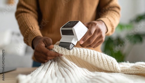 Fototapeta premium Man Using Device To Repair Knitted Sweater