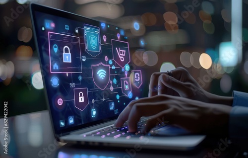 © Iswanto, Fototapeta premium Man using laptop with floating security icons. Concept of digital privacy and online protection.