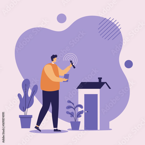 Obraz premium Man using smart home technology to control devices with a remote and smartphone, illustrating modern home automation and connectivity for efficient living.