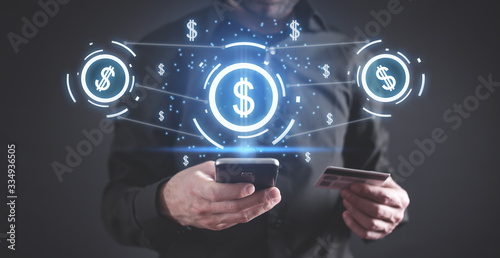 Fototapeta premium Man using smartphone. Dollar symbols. Network. Internet banking
