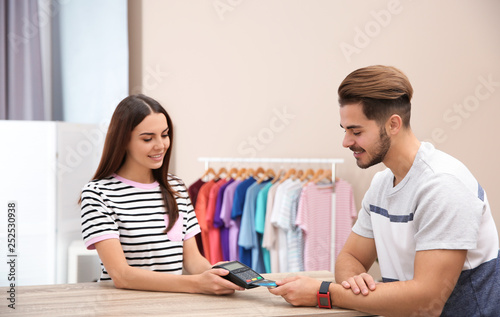 © New Africa, Fototapeta premium Man using terminal for credit card payment in shop