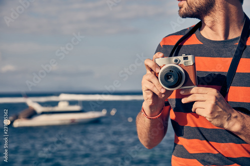 Obraz premium Man using vintage film camera on a ocean / sea vacation.