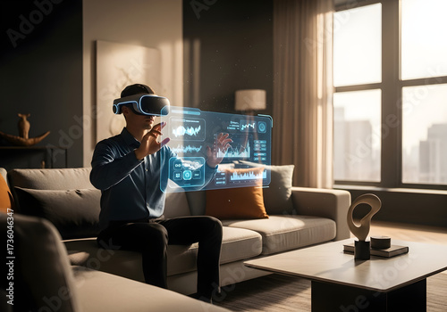 © Danseh, Fototapeta premium Man using virtual reality headset analyzing data, futuristic interface in modern living room.