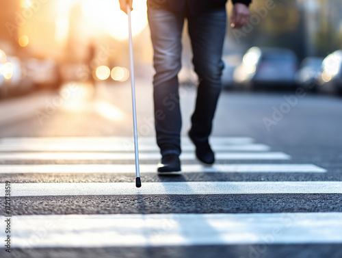 Fototapeta premium Man using white cane while crossing street in urban setting