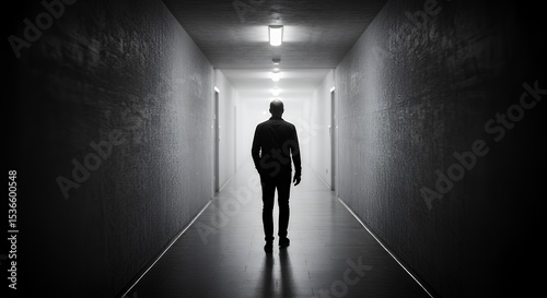 Obraz premium Man Walking Down Long Dark Hallway Towards Light Source