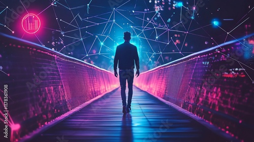 © ari, Fototapeta premium Man walking futuristic neon bridge, digital network.