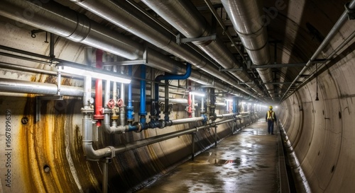 © Margarita Ratatosk, Fototapeta premium Man walking in a long underground tunnel with large industrial pipes and valves. Heating system pipeline infrastructure.
