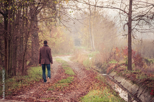 Fototapeta premium Man walking on a dirty road between fog and trees