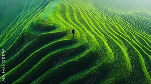 © tunanon, Fototapeta premium Man Walking on Lush Green Grassland from Above