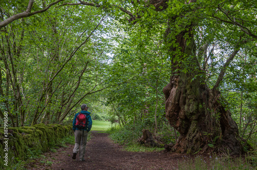 © Gianluca, Fototapeta premium Man walking on Scottish road in the woods, bordered by an old wall and big trees. Concept: physical activity and relaxation in a natural environment, travel to Scotland