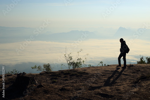 Fototapeta premium Man walking on the cliffs and mist at Phu Kradung National Park,Thailand